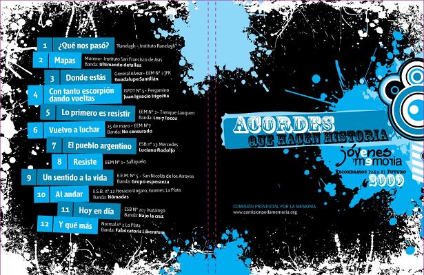 Aquí está el disco. Parece un objeto inerte, pero apenas se despliega empieza a destilar vida. Adentro están las voces de un puñado de jóvenes en plena búsqueda: dialogando con el pasado inmediato, cuestionando, trazando caminos posibles, equivocándose y volviendo a empezar. Son las doce canciones detrás de Acordes que hacen historia, el resultado de un concurso organizado en las escuelas secundarias de la provincia por el área de Investigación y Enseñanza de la Comisión Provincial por la Memoria. Un disco propulsado por el entusiasmo de los chicos y una analogía fundamental: “acorde y recuerdo tienen una misma raíz –explica el booklet-. Los acordes implican una construcción, donde tres o más notas diferentes se disponen y combinan de manera armónica. Como la memoria, las canciones conforman relatos compuestos de acordes, que según su combinación pueden crear melodías diversas. Como el recuerdo, los acordes involucran en sus significados a los sentimientos y la subjetividad. Aún cuando se narran experiencias límites, atravesadas por tensiones y conflictos, los relatos siempre buscan la armonía a través de enlazar las palabras, sintetizar ideas y acordar, a pesar de sus múltiples versiones, sobre los sentidos que el pasado encierra para el presente”.