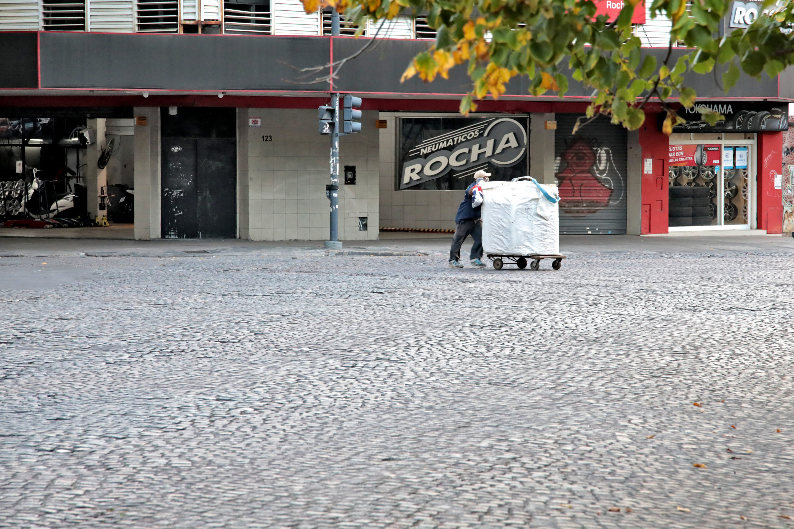 Un rato antes, a menos de cien metros de allí, Gabriela Hernández, la fotógrafa de La Pulseada capta con su cámara la figura de un hombre que podría ser cualquiera de los siete que se encontraron en Plaza Rocha. Pero no es. Porque no lleva la camisa azul ni su carro parece contar con la misma capacidad de carga. Seguramente ya no puede usar caballo porque la Municipalidad se lo quitó o porque sabe que si lo localizan esa será su suerte. Dobla los cartones para optimizar el espacio y sigue por calle 6, tal vez emprendiendo una larga caminata de regreso, en soledad. Su rostro se adivina serio debajo del barbijo. Sabe que tendrá que pelear el precio en alguno de los pocos galpones abiertos que compran el material al valor más bajo posible, usando balanzas sospechadas de ir a menos.