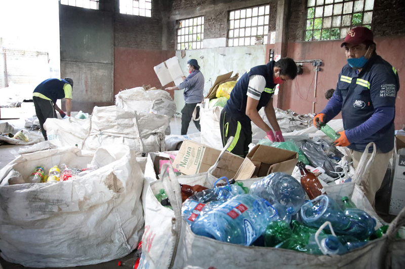 Al fondo, Federico Antipán, Walter Vazquez y Mariano Cantero trabajan sobre seis o siete bolsones que están llenos de botellas de plástico y de vidrio. Parecen concentrados y hablan poco debajo de sus barbijos rojos. Trabajan con guantes y sistemáticamente ubican cada objeto seleccionado en el lugar correspondiente.