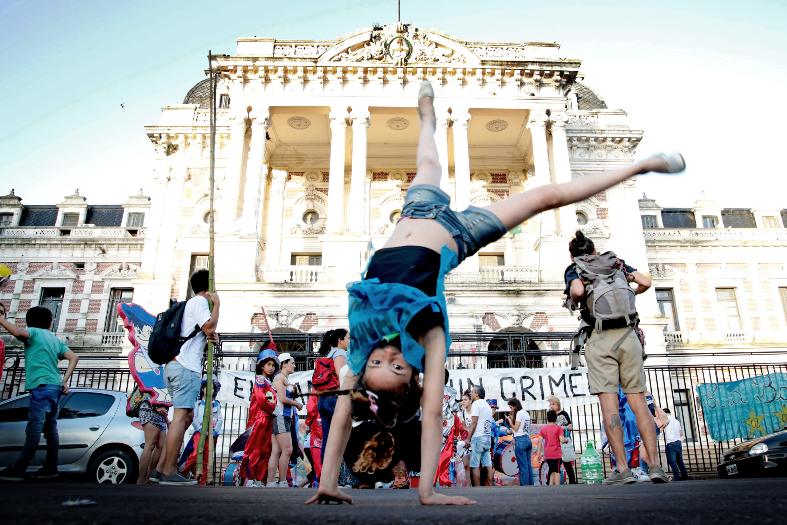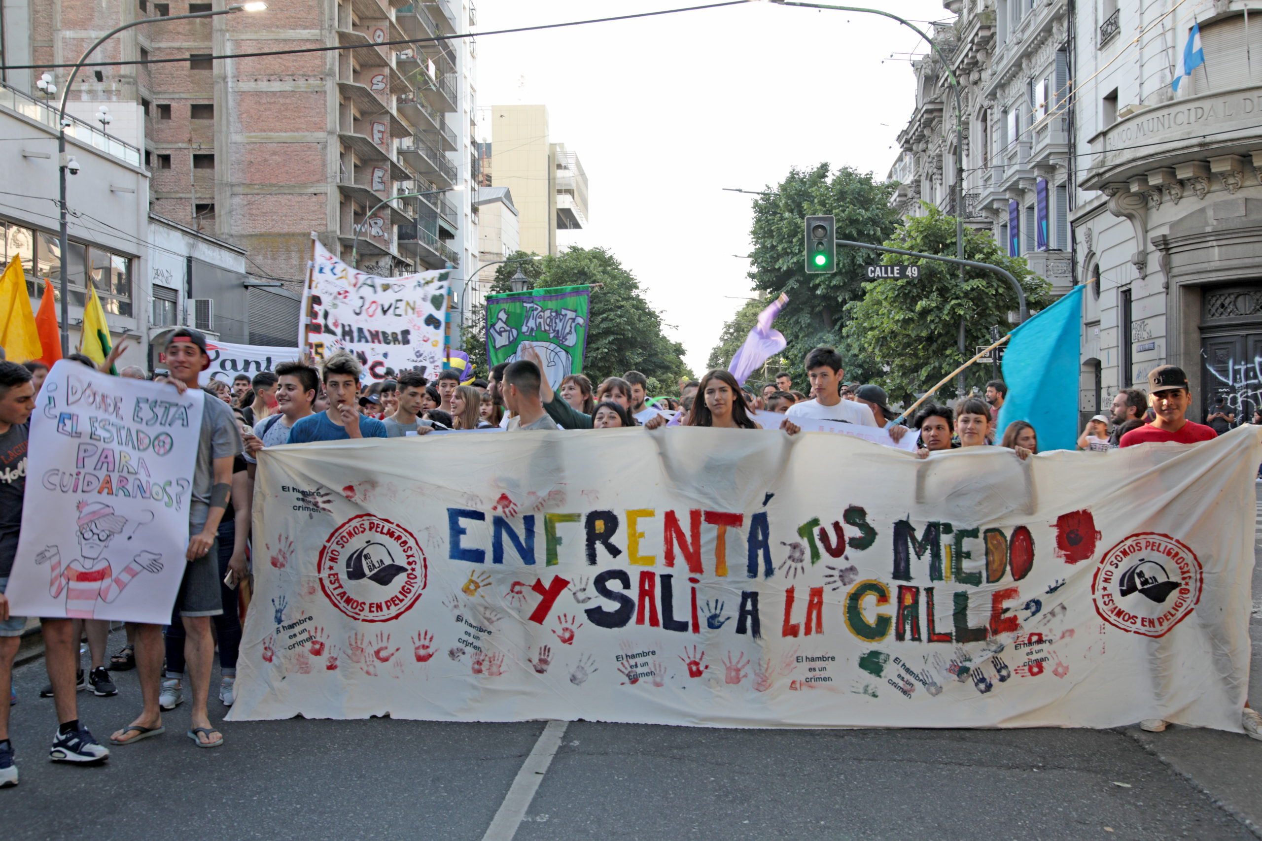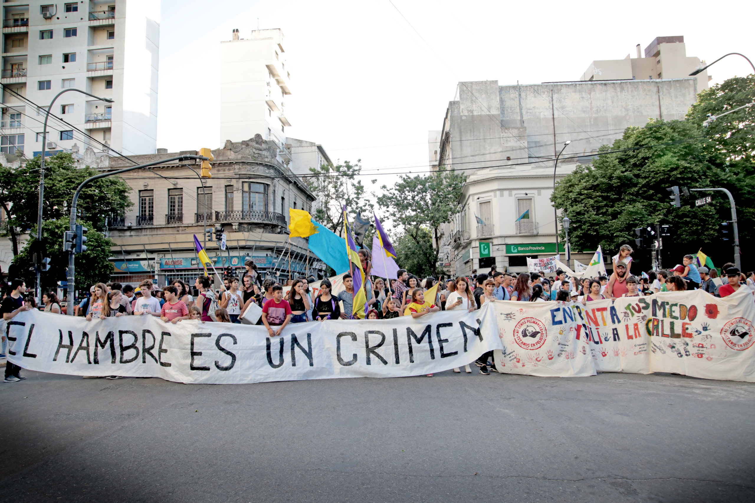Después de la proyección, los pibes y las pibas marcharon hasta Plaza San Martín, al ritmo de la murga y de cantitos improvisados. Muchos/as llevaban las banderas de sus organizaciones -espacios culturales, centros de día, comedores comunitarios- como estandarte y esa consigna que abraza tantas otras: “El hambre es un crimen”.