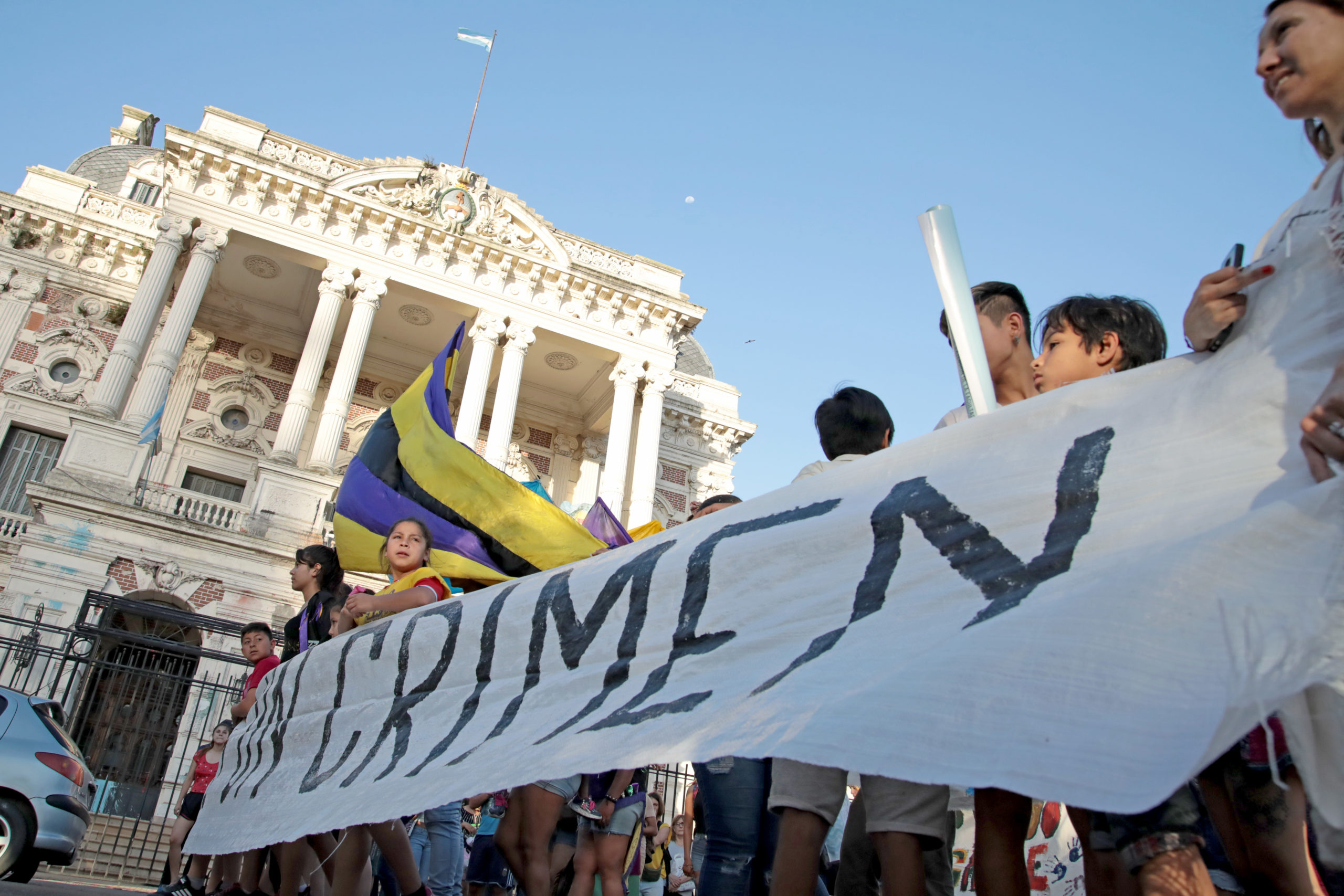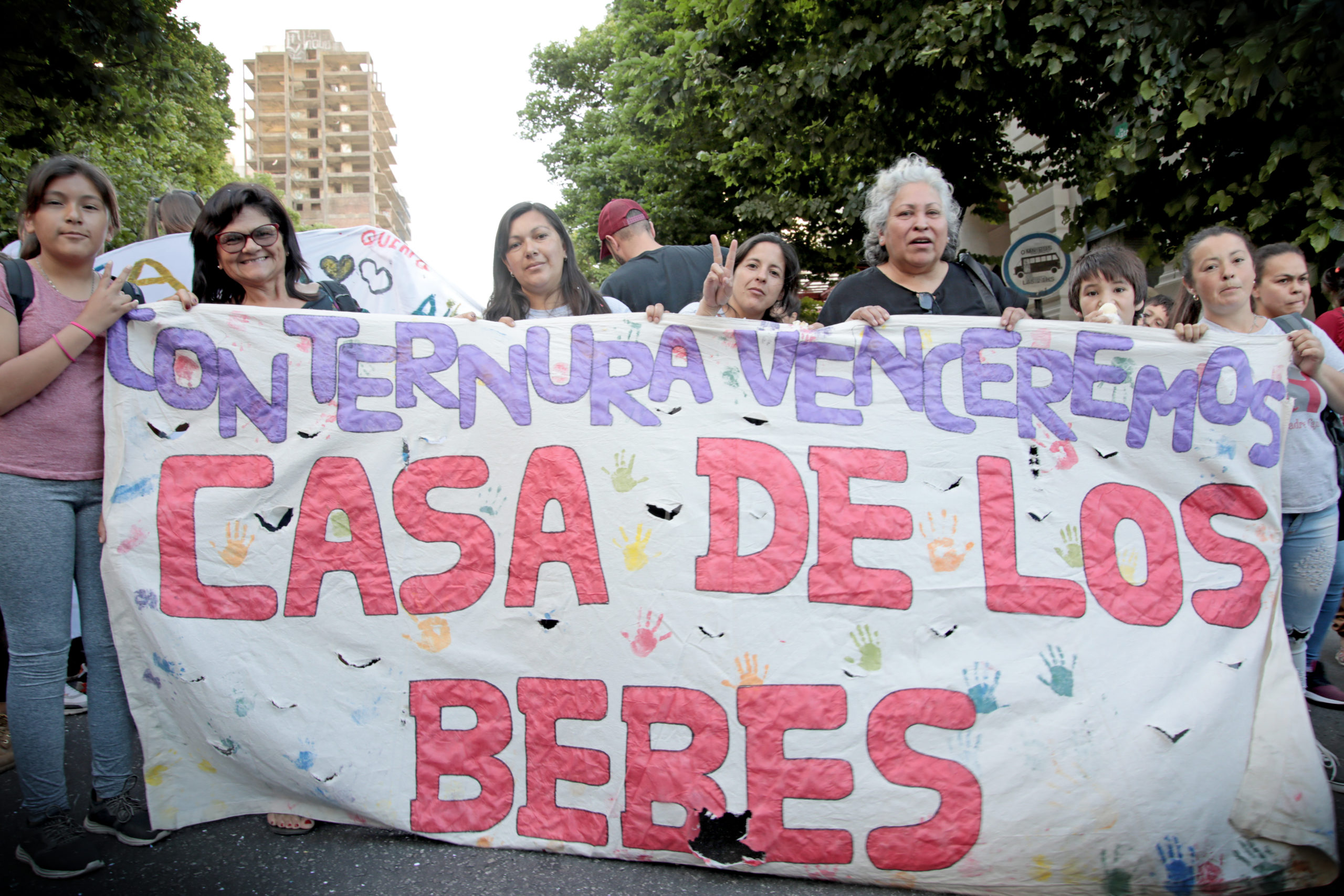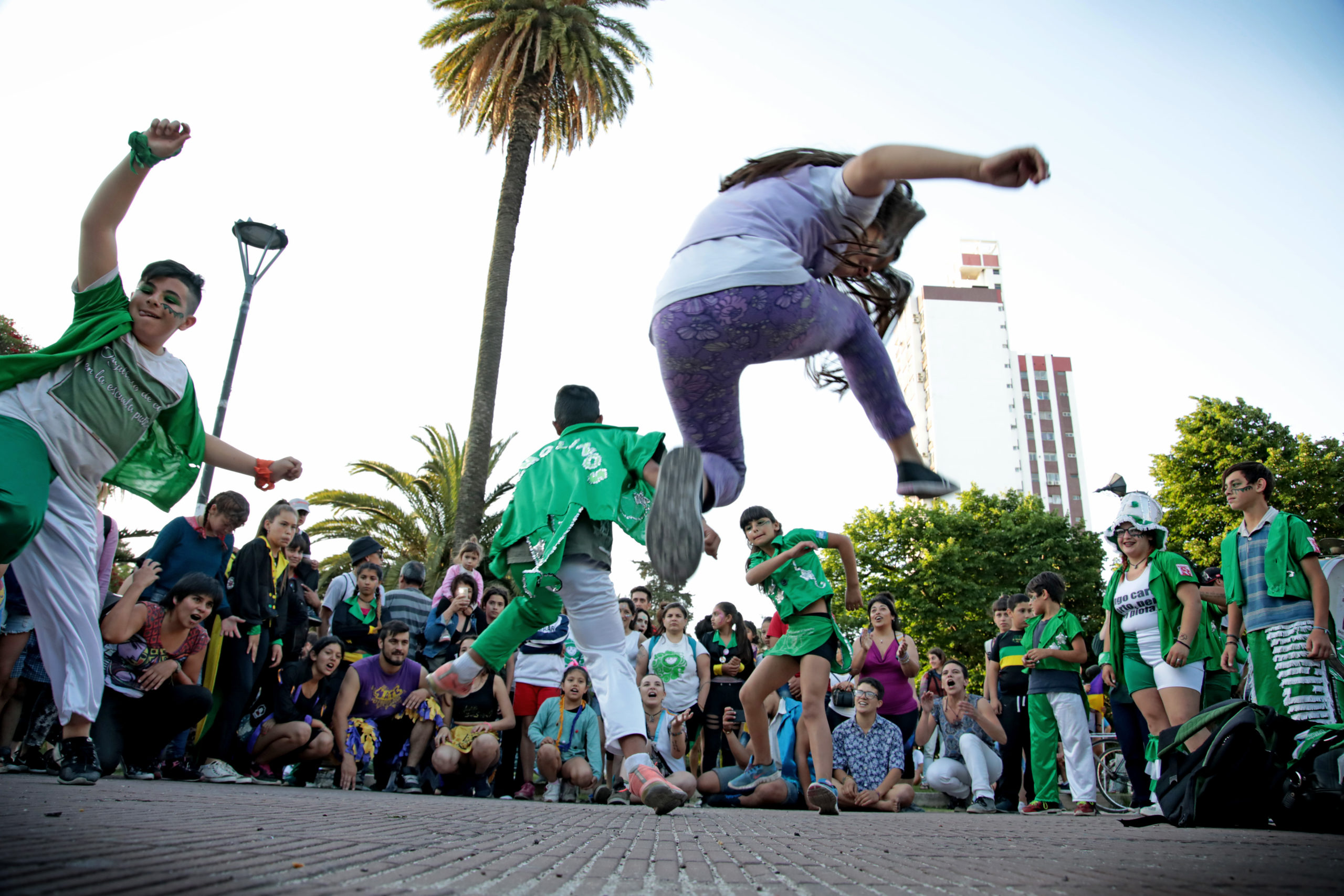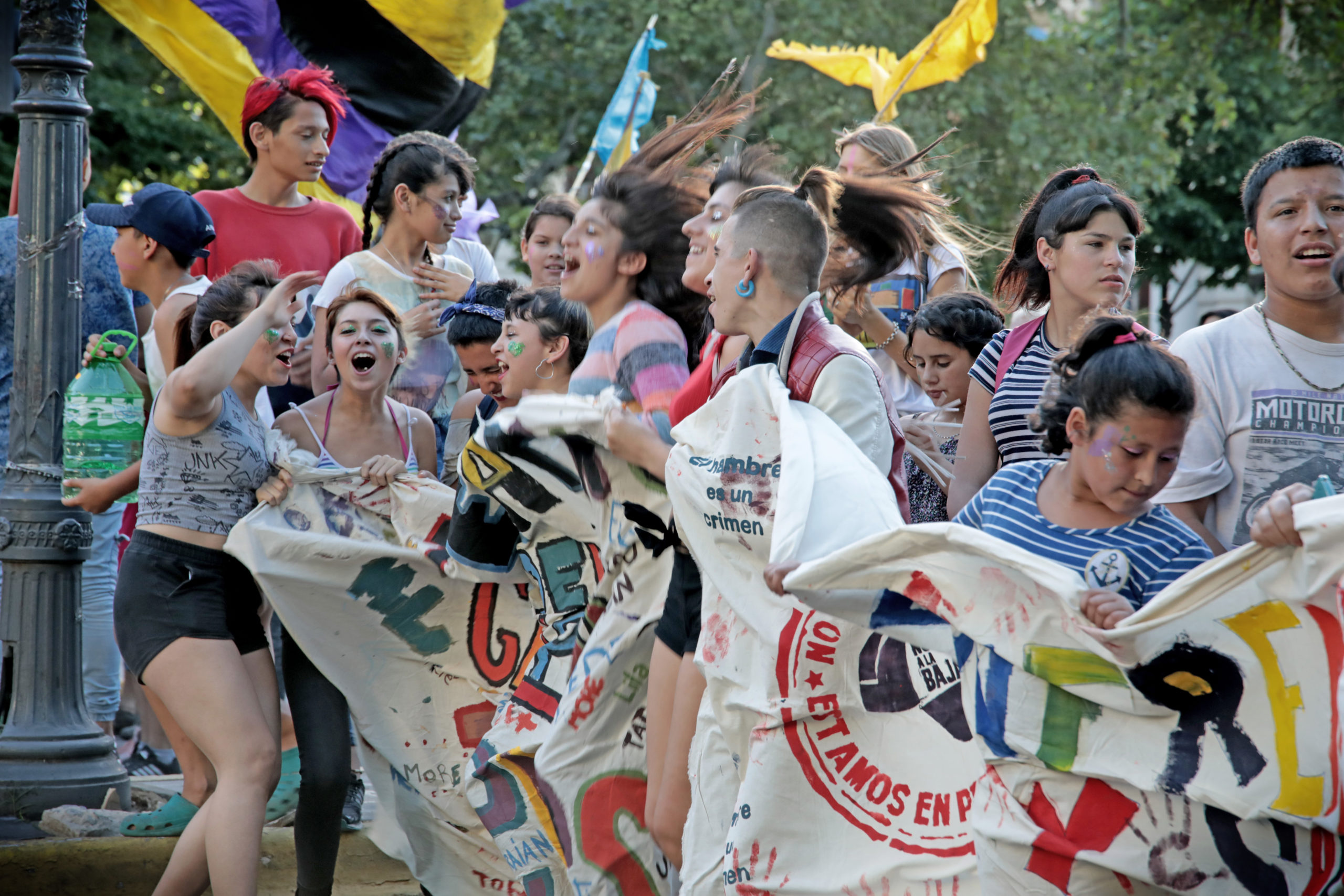 Después de la proyección, los pibes y las pibas marcharon hasta Plaza San Martín, al ritmo de la murga y de cantitos improvisados. Muchos/as llevaban las banderas de sus organizaciones -espacios culturales, centros de día, comedores comunitarios- como estandarte y esa consigna que abraza tantas otras: “El hambre es un crimen”.