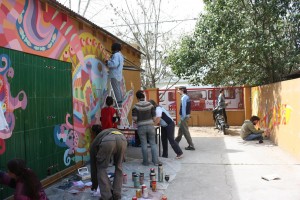 Los pintores fueron alumnos de la materia Pintura III del Taller de Pintura Mural de la Facultad de Bellas Artes de la Universidad Nacional de La Plata a cargo del profesor Hugo Follonier. Todos ellos están en la foto que tiene el mural como fondo. No pudimos conseguir que nuestra compañera Verónica Ducca posara junto a ellos, aunque debió haber estado porque fue ella la que consiguió la pintura, los pinceles y demás implementos que utilizaron estos 25 estudiantes que trabajaron corrido de 8 a 18 durante 9 días, incluido el fin de semana.