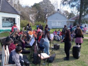 Escuchamos decir repetidas veces en la tele, en la radio y en la calle que a lxs pibxs no les interesa nada, que no se “enganchan ninguna propuesta”, que son apáticxs. Como contrapunto traemos la imagen de esta propuesta musical que está llena de pibxs. Jóvenes y niñxs eligen estar en este espacio y sostienen su pertenencia porque, como nos han expresado, son lugares en los que les gusta estar y donde se sienten queridxs, escuchadxs, reconocidxs y hay adultxs en los que apoyarse.
