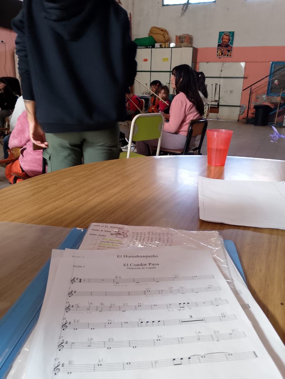 Cada ensayo lxs pibxs llegan con su instrumento colgado y las partituras que se llevaron para practica. Decimos “su” instrumento porque, aunque son de la organización social, para muchxs es el mismo que lxs acompaña ya desde hace un año y cada uno sabe cuál le pertenece. Es ese violín, esa guitarra, y ese xicus a la que le cuelgan llaveritos, algún sticker, y al que cuidan como el bien más preciado.