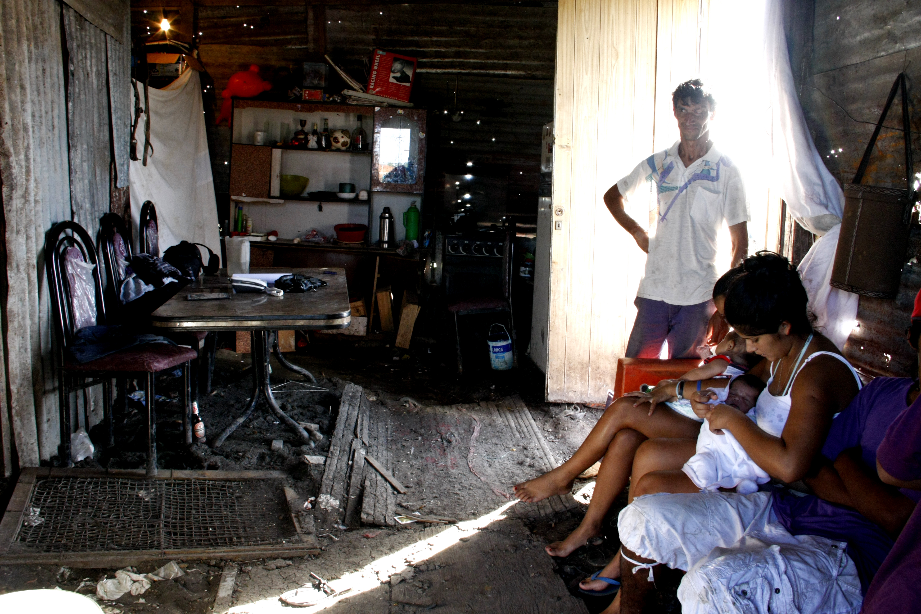 Ahora la que habla es María: “Esta situación te pone mal, porque vos tenés un bebé y nadie te ayuda y decís ‘¿Cómo podés tener a tu hijo así?’ La intención de nosotros es…”. María se quiebra, hace una pausa, llora. Cuando recupera el aliento vomita palabras como puede: “Yo necesito que me ayuden porque no puedo tener a mi hijo acá. ¿Sabés cómo me duele cuando se inunda todo? ¿Sabés los virus que le pueden agarrar porque esta agua está toda podrida? El único lugar que tenés seco es la cama. Casi todos tenemos los pies todos paspados, lastimados. A mí me duele un montón estar así sabiendo que tenemos gente que nos puede ayudar pero no nos ayudan porque siempre tienen una excusa. Yo necesito que me ayuden porque yo también soy persona, mi hijo también, todos los que estamos acá. Ellos también, ellos son chiquitos todavía —con referencia a su hermano Alexis, que está sentado a un costado—. No estamos pidiendo que nos hagan una re mansión, porque no queremos eso. Nosotros gracias a Dios tenemos manos, piernas, podemos trabajar. Pero lo que necesitamos es algo que nosotros no podemos lograr. Yo no puedo comprar una camionada de escombros sabiendo que tengo a mi hijo al que le tengo que comprar leche y pañales. No puedo hacer eso”.