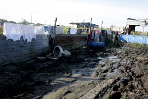 Las cuatro casas que armaron los Larrosa se parecen entre sí. Todas son de chapa y madera con piso de tierra. En el interior, una división separa lo que sería una cocina comedor, de una habitación donde hay una cama. Ninguna de las casas tiene agua corriente ni gas. Todas tienen pozo para los desechos cloacales. Todas se inundan cada vez que llueve.