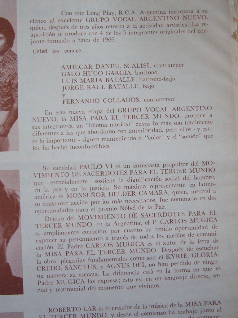 En 1973 el padre Carlos Mugica escribió la Misa para el Tercer Mundo, una versión libre de la ofrenda religiosa no destinada al uso litúrgico sino a promover la revolución de Cristo y el hombre nuevo. Roberto Lar musicalizó las estrofas y convocó al famoso Grupo Vocal Argentino Nuevo, que seis años antes había grabado con singular éxito la Misa Criolla de Ariel Ramírez. El propio Mugica asistía a los ensayos y daba indicaciones. Participaron cincuenta de los mejores músicos (Domingo Cura, Kelo Palacios, Oscar Alem, Domingo Mancuso, entre otros), pese a lo cual la grabación se hizo en menos de un mes: del 10 de diciembre de 1973 al 8 de enero de 1974. Al poco tiempo, el 11 de mayo la Triple A asesinó al padre Mugica. Después de varios meses y de muchas cavilaciones, se decidió homenajearlo lanzando el disco y presentando la Misa en vivo en el Instituto de Cultura Religiosa Superior de Buenos Aires. El Ejército irrumpió en el ensayo y destruyó los 50.000 discos que se habían editado. Sólo se salvaron algunos ejemplares, los que habían sido entregados a los músicos y dos o tres que rescató Julio García, ejecutivo de la RCA Víctor, el sello grabador.